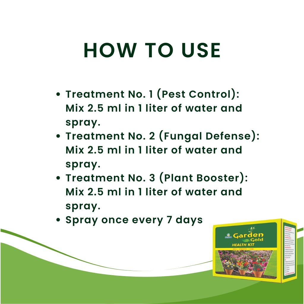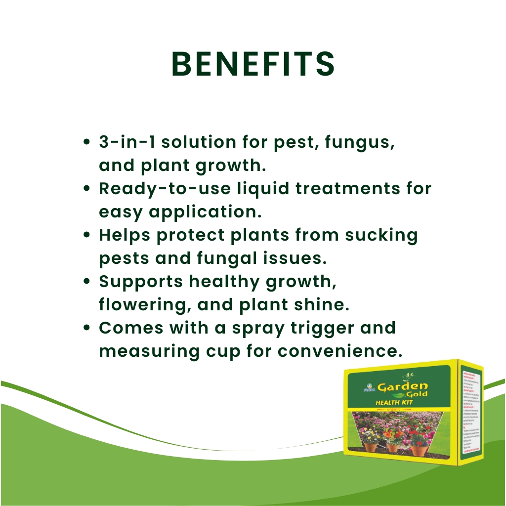 Garden Health Kit is a 3-in-1 plant care solution specially made for home and kitchen gardens. Small garden plants often face pest attacks, fungal issues, and weak growth, but treating them with regular farm pesticides can be difficult due to their size and quantity. This kit provides three ready-to-use treatments that help protect plants from pests and fungus, and support their overall growth. It is easy to apply with a measuring cup and spray trigger included in the pack. The kit is suitable for all types of ornamental, flowering, and vegetable plants in home gardens.
