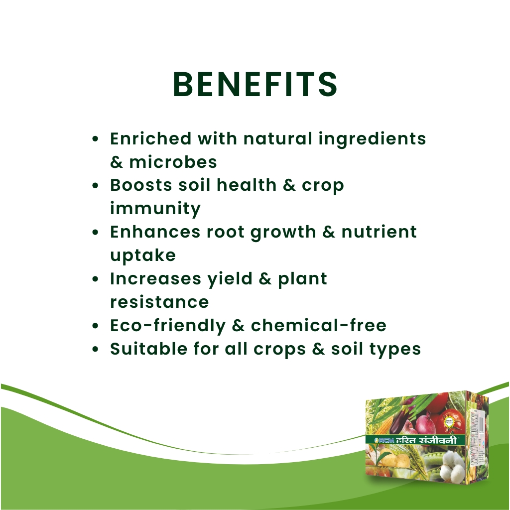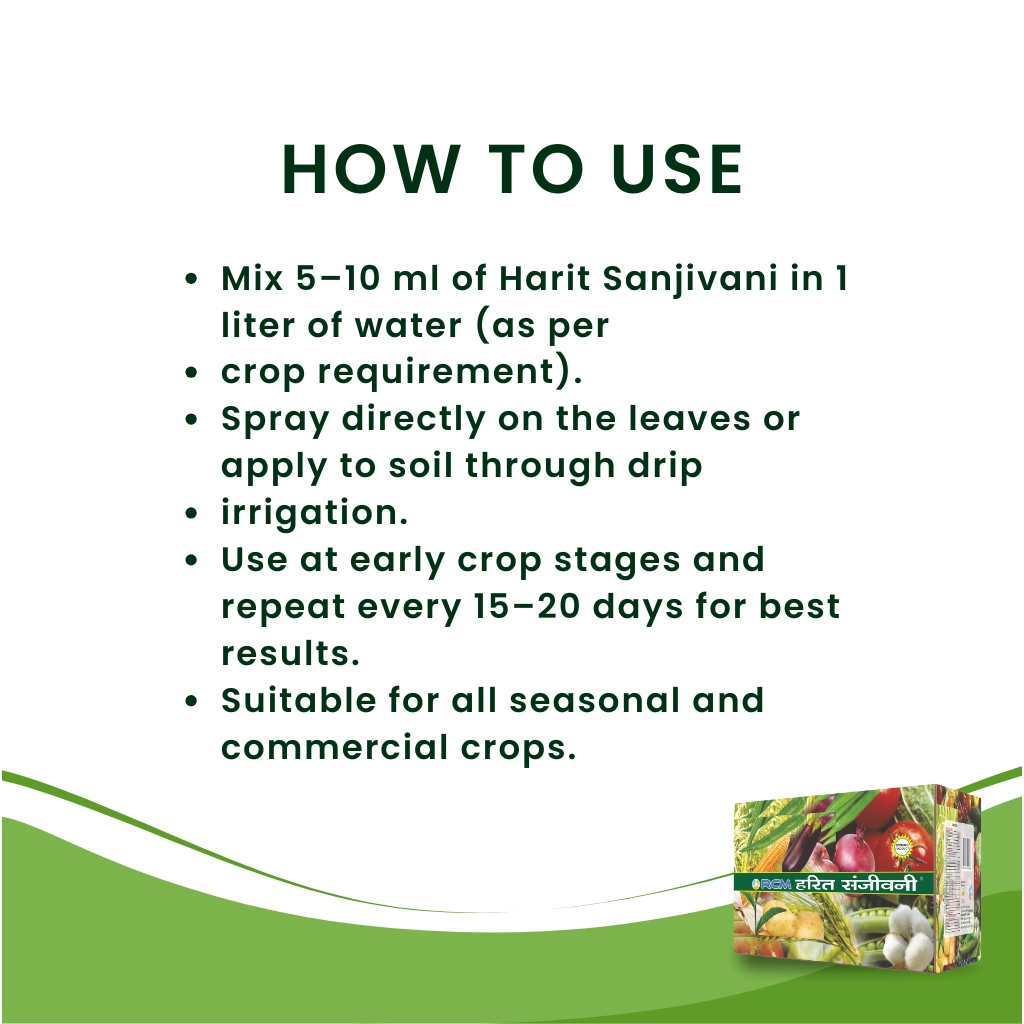 Harit Sanjivani is a complete treatment made to take care of your crops at every stage—from soil preparation to fruiting. It comes in four pouches, each meant for a specific growth stage. This treatment helps improve soil quality, boost root development, and make nutrients easily available to the plants. It helps in increasing yield from the crop by supporting healthy and balanced growth throughout the season. Designed for use on 1 acre (750 gm pack) or half acre (375 gm pack), it provides timely crop care from sowing to harvest.