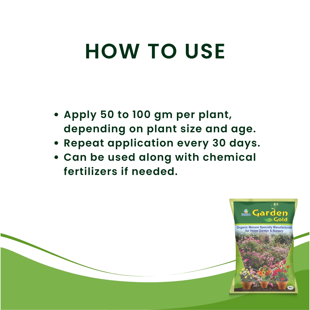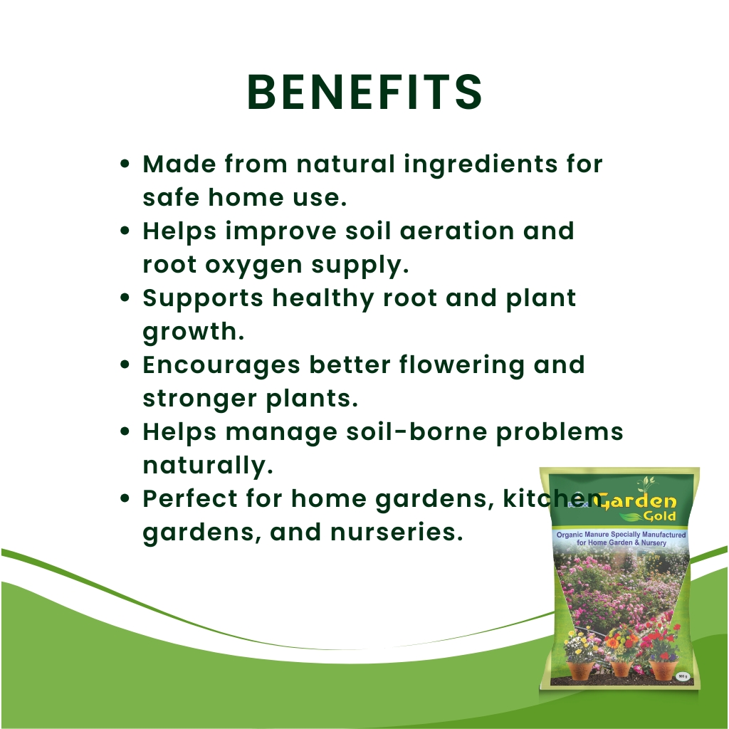 Garden Gold is a specially developed natural manure for home gardens and nurseries. It is suitable for use on flowering plants, vegetables, medicinal herbs, and ornamental plants. This treatment helps improve soil aeration and provides more oxygen to plant roots. It supports stronger root development, healthier plants, and better flowering. Garden Gold also helps in managing soil-borne issues by encouraging beneficial microbes. It’s easy to apply and supports overall plant growth, keeping garden plants lush, green, and healthy throughout the year.